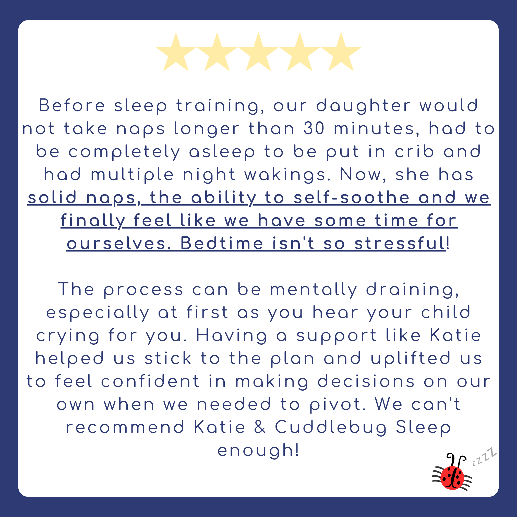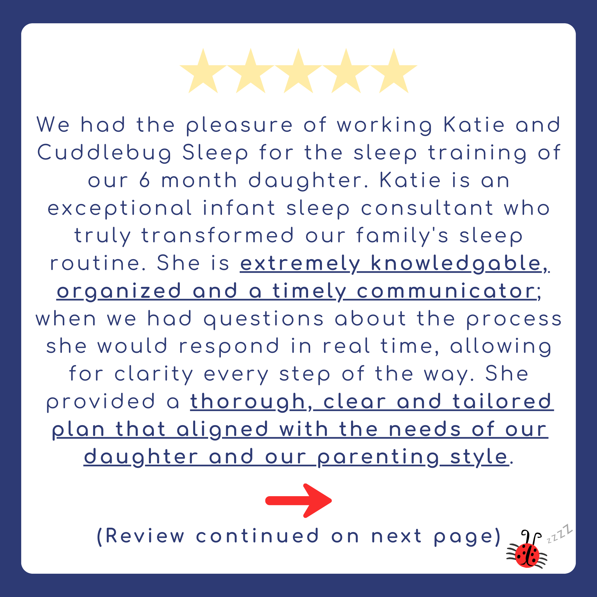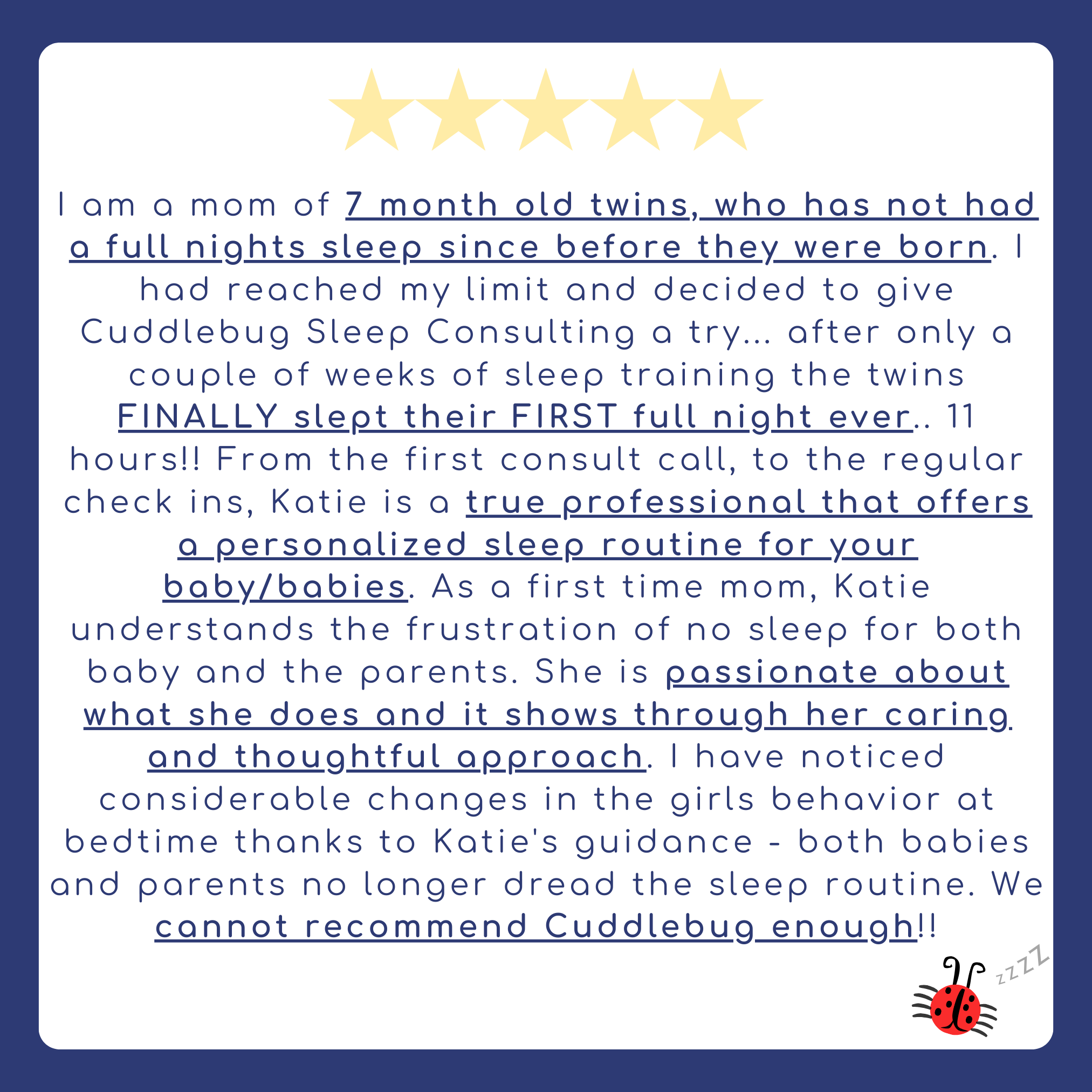 Cuddlebug Sleep Consulting’s business hours are Monday - Friday 9am to 5pm. All responses to emails, text messages, and feedback on electronic sleep logs will be responded to during normal business hours.